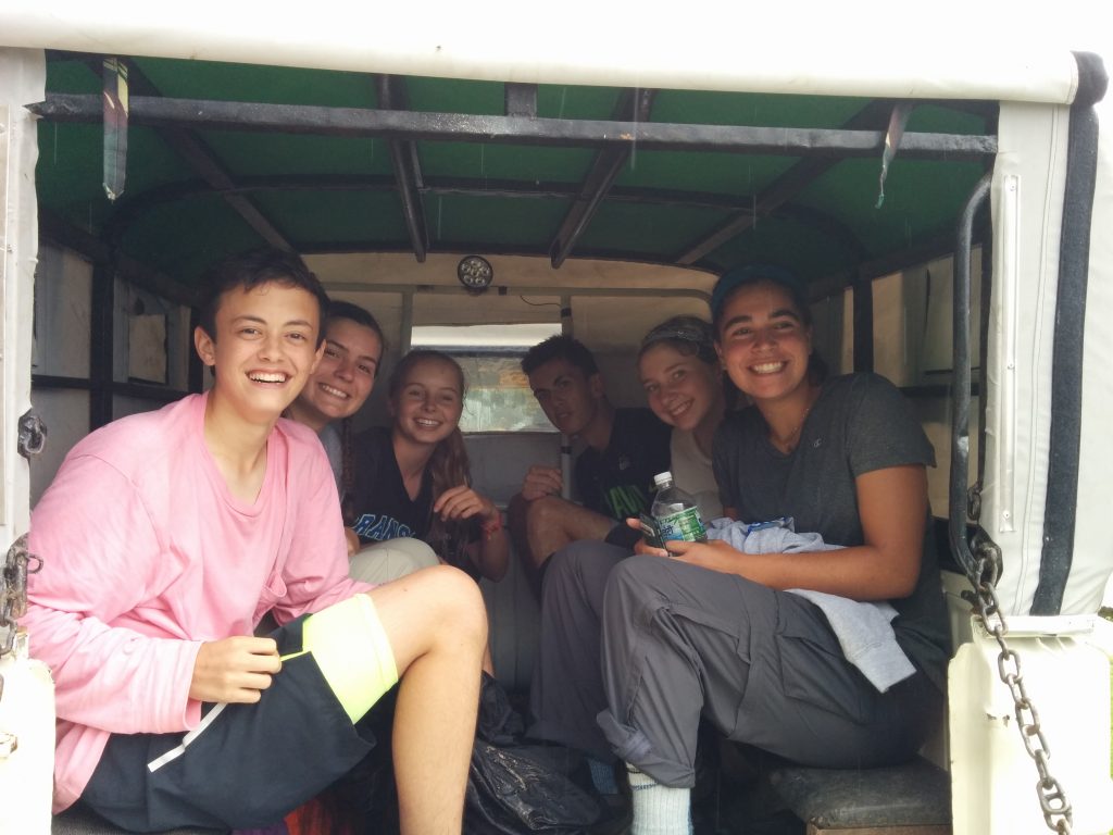 In the back of the jeep, ready to drive over waterfalls and potholes.